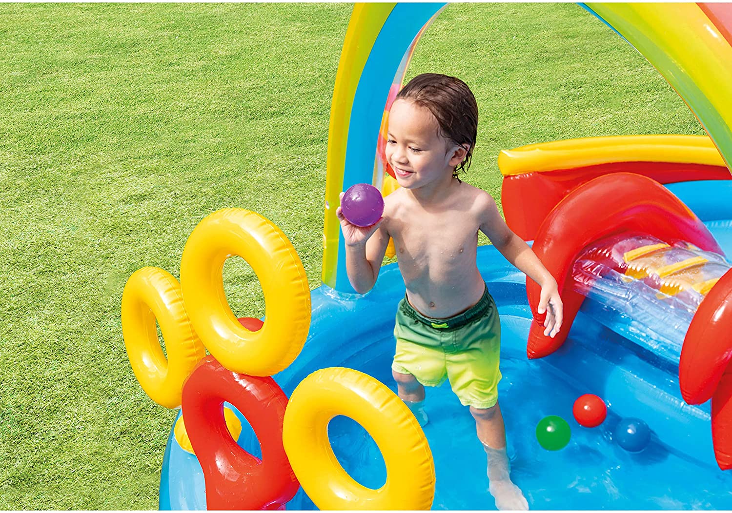 Gorgeous inflatable paddling pool for children. Extremely easy to set, all you have to do is inflate it and the pool is ready for use. This set includes 6 Fun Ballz plastic balls with a diameter of 8 cm. Kids will love going down the slide and then dive into the colourful and amazing pool. The set includes the following water games and accessories: a slide, a refreshing shower on the top of the rainbow, playing rings (4 inflatable rings included) and two slides for balls located at the sides of the pool.
